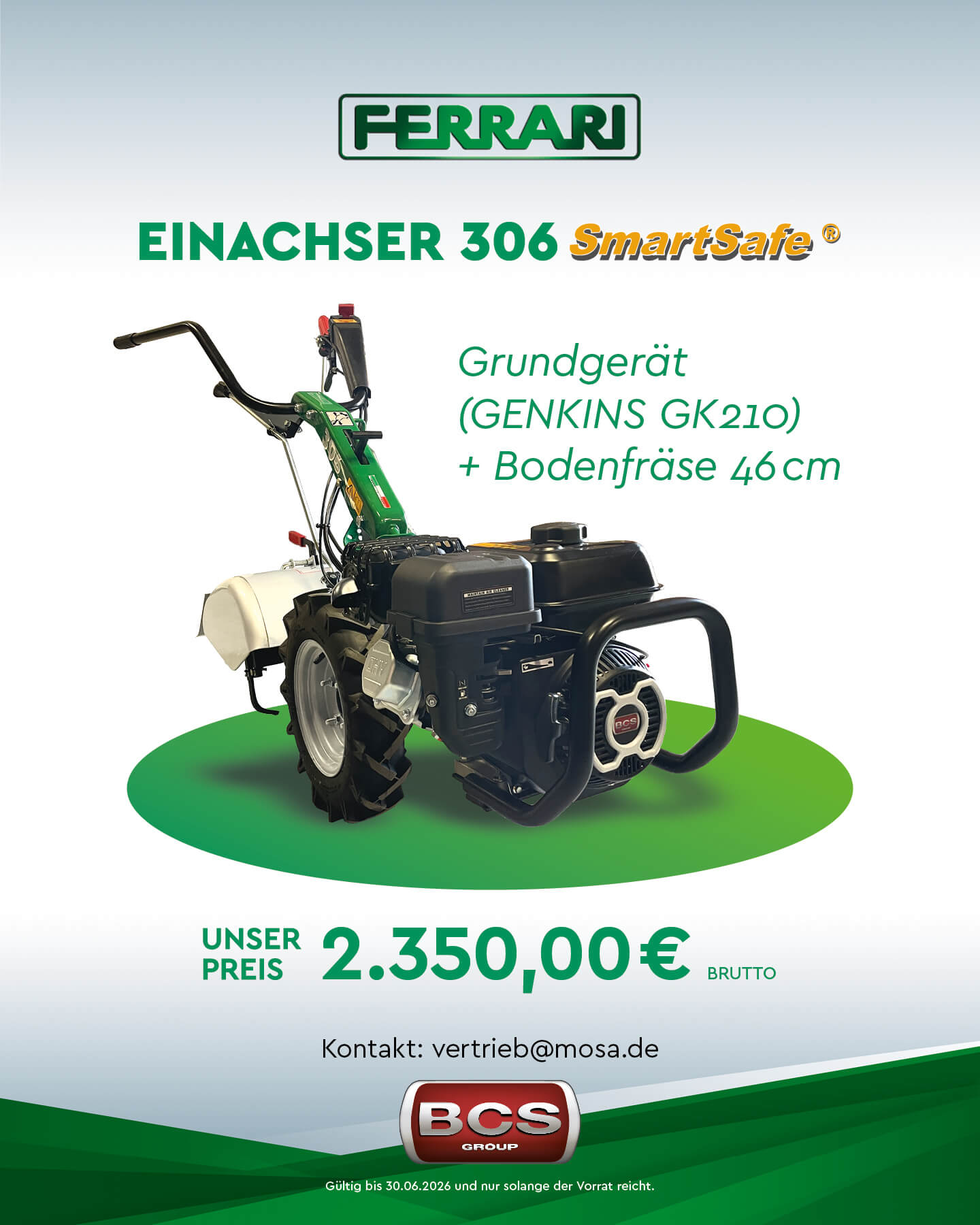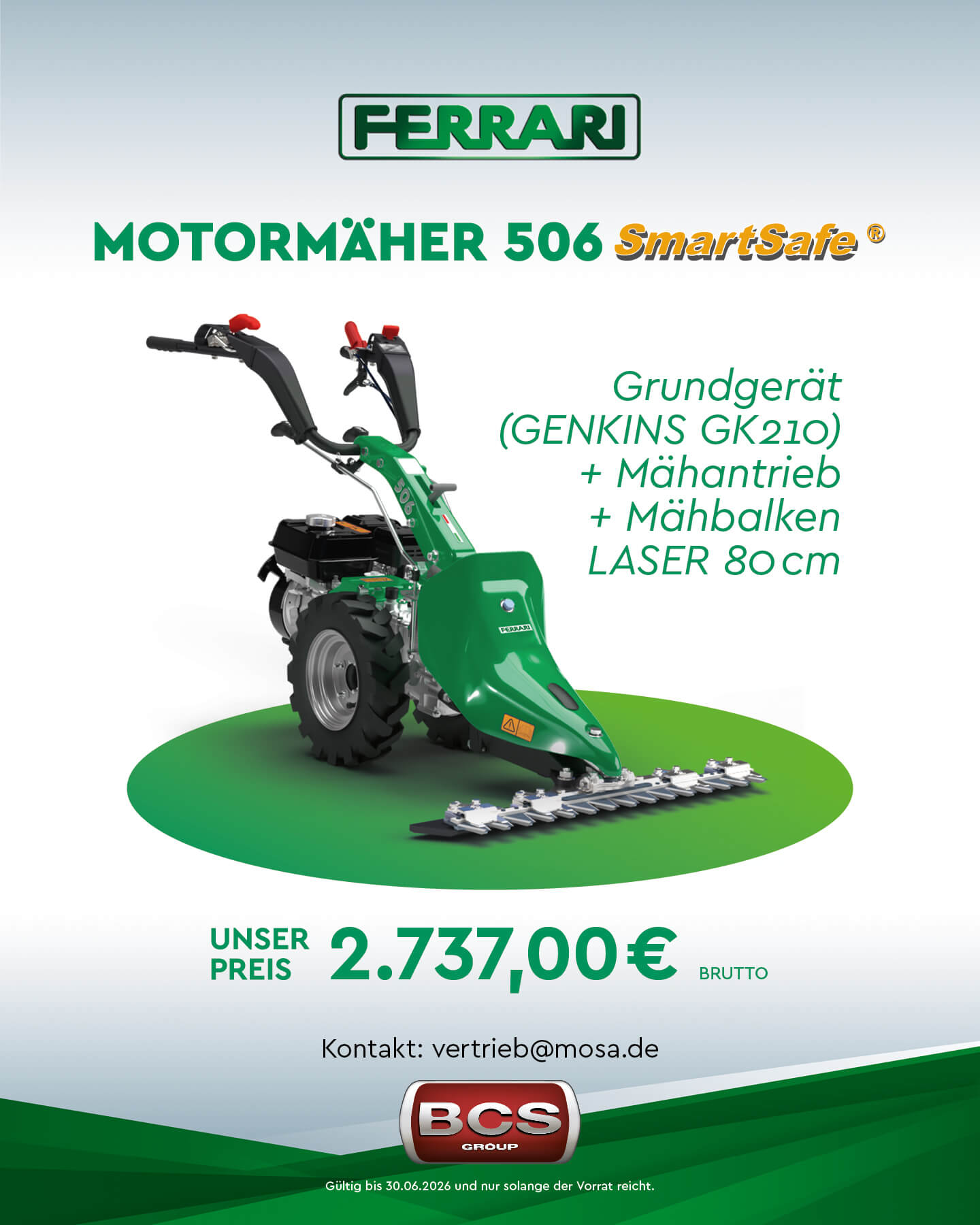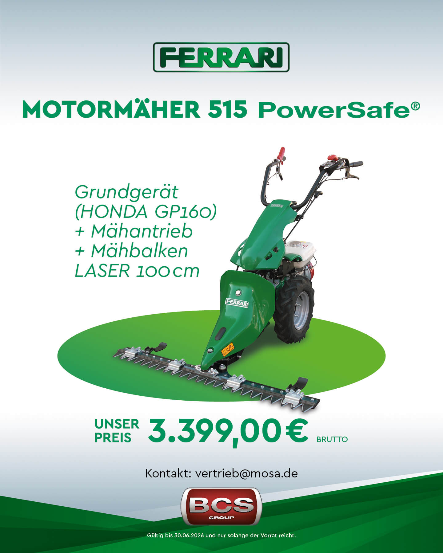 Wir führen und betreuen die gesamte FERRARI-Produktpalette der innovativen BCS Group, angefangen vom kleinen Motormäher über den multifunktionalen Einachser bis hin zu den modernsten FERRARI Traktoren mit bis zu 98 PS Spitzenleistung.